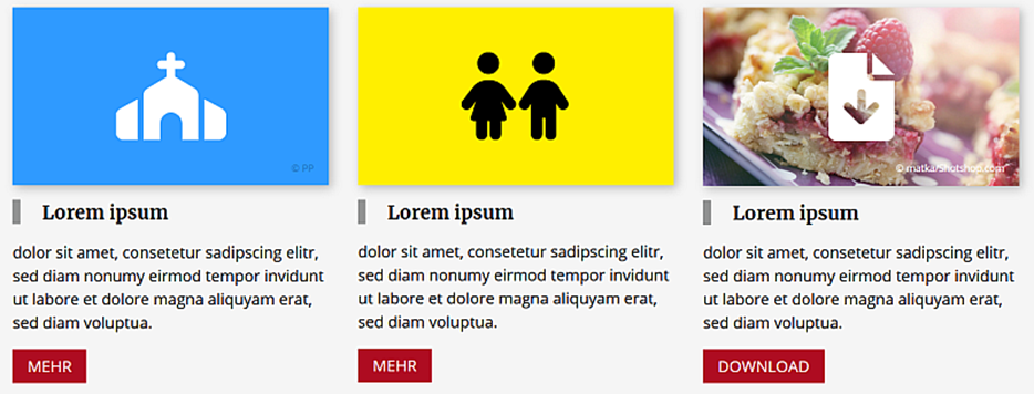 Im Seitenelement Teaser können Sie zusätzlich zu beliebigen Bildern aus Ihrer FLIB Mediathek auch Icons zu den verschiedensten Themen nutzen, die in FLIB gespeichert sind. Dies sieht dann z.B. so aus: