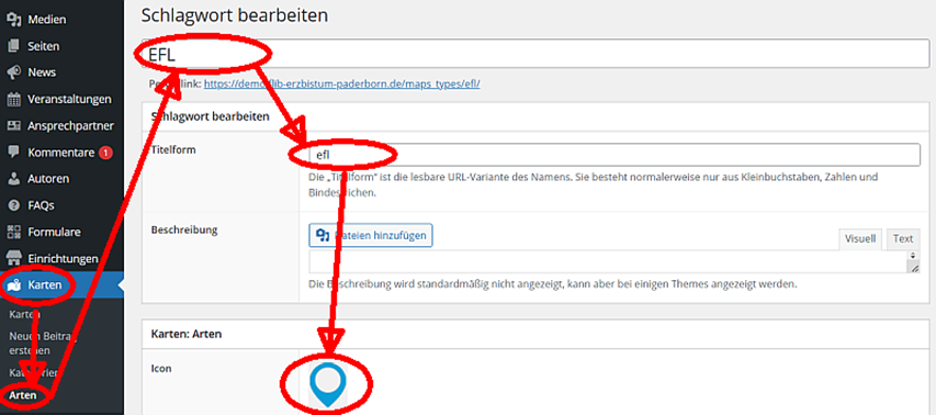 Dies benötigen Sie, um ggf. die Standorttypen (z.B. Kirche, Pfarrbüro, Schule etc.) mit je eigenen Standortfähnchen markieren zu können. Standortarten brauchen Sie auch für die Markierung von Wegpunkten auf einem Wanderweg o.ä. Hier sehen Sie zwei Beispiele: