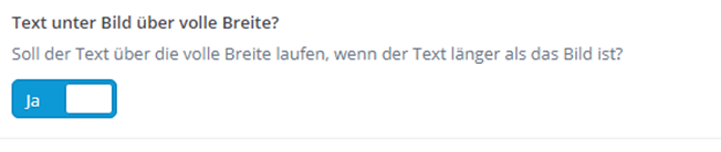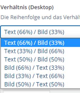 Über das Dropdown-Menü „Verhältnis“ können Sie bestimmen, wie viel Platz der Text oder das Bild in der Breite einnimmt. Beachten Sie bitte, dass dies nur für den Desktop-Geräte gilt, für die mobile Ansicht gibt es einen Standard, der im Template fest hinterlegt ist.