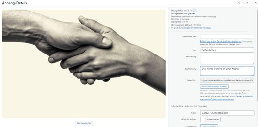 Wenn Sie auf ein hochgeladenes Bild klicken, können Sie die Metadaten des Bildes bearbeiten. Metadaten sind wichtige Informationen für Google, aber auch für alle Website-Besucher.