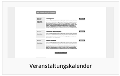 In diesem Seitenlement „Veranstaltungskalender“ machen Sie einige grundsätzliche Einstellungen (siehe weiter unten). Wenn Sie dann zur Seitenansicht wechseln, erscheint an dieser Stelle der Kalender mit Veranstaltungsterminen. Voraussetzung: Sie haben unter Veranstaltungen schon mindestens eine Veranstaltung eingepflegt.