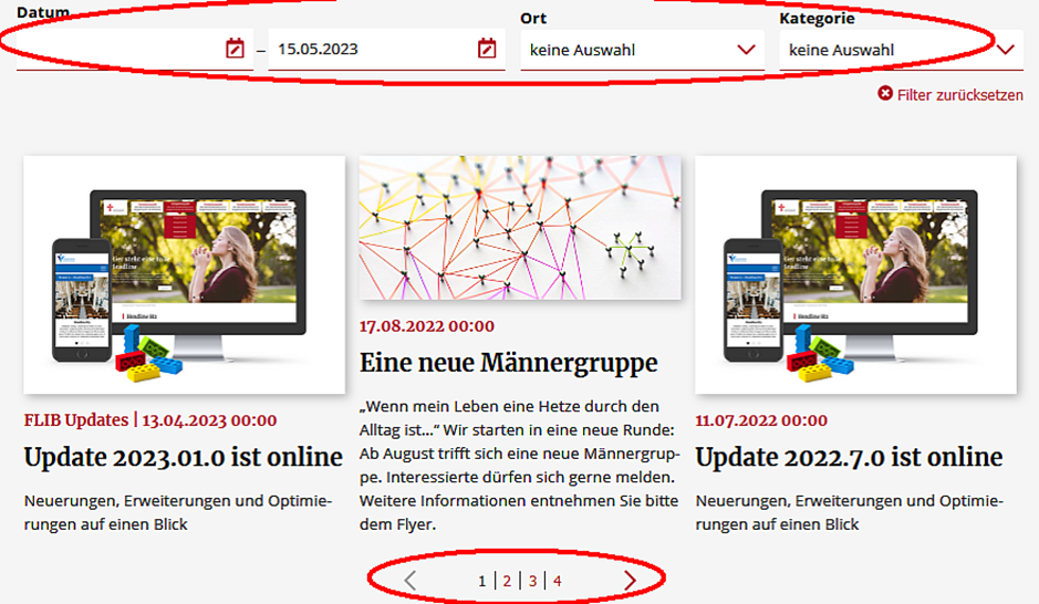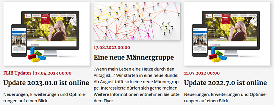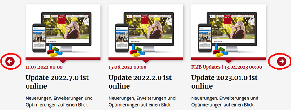 Bei dieser Darstellung sind max. drei News direkt sichtbar (Desktop). Sie können durch alle News navigieren, indem Sie auf den rechten bzw. linken Pfeil klicken.