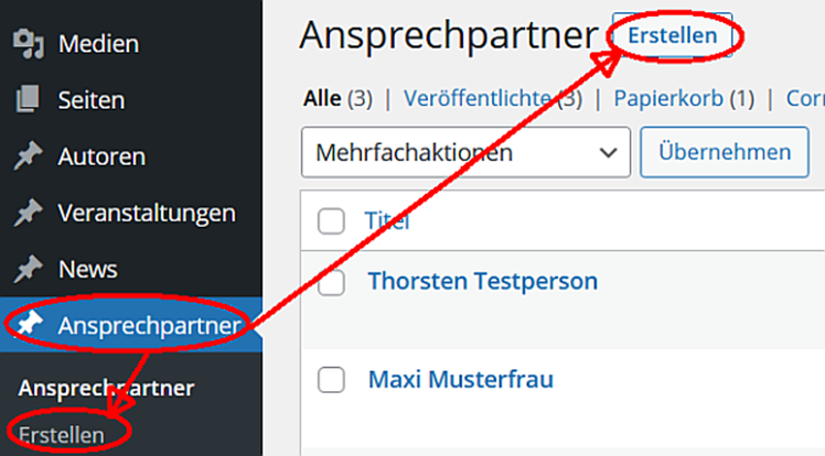 Gerne können Sie auf „Veröffentlichen“ klicken, da dieser Eintrag jetzt noch nicht auf Ihrer Website erscheint. Zum tatsächlichen Veröffentlichen benötigen Sie das Seitenelement „Ansprechpartner“. Das wählen Sie auf der Seite bzw. den Seiten aus, wo die Ansprechperson erscheinen soll. Im Ansprechpartner-Seitenelement können Sie dann die Person auswählen: