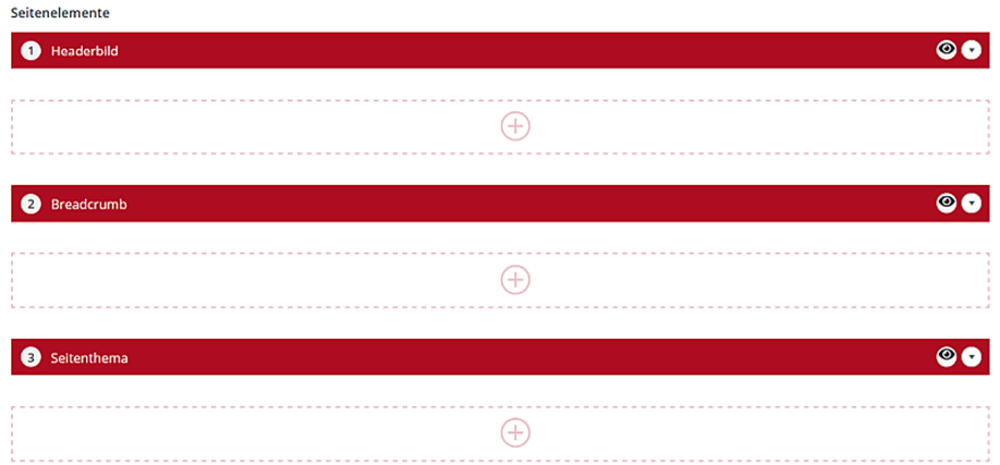 Mit den Seitenelementen gestalten Sie die Inhalte Ihrer Website. Standardmäßig legt das System für Sie schonmal diese drei Seitenelemente an: Headerbild, Breadcrumb, Seitenthema. Wir empfehlen Ihnen, jede Ihrer Homepageseiten mit diesen drei Elementen in genau dieser Reihenfolge beginnen zu lassen: