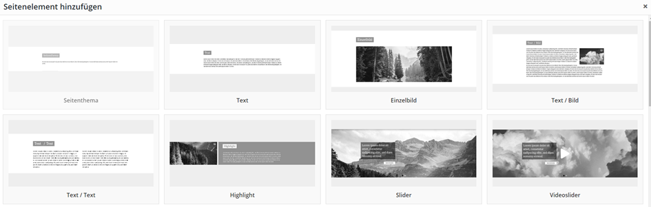 Es erscheint eine Übersicht aller Seitenelemente. Durch einen Klick auf ein Element fügen Sie dieses Ihrer Seite hinzu.