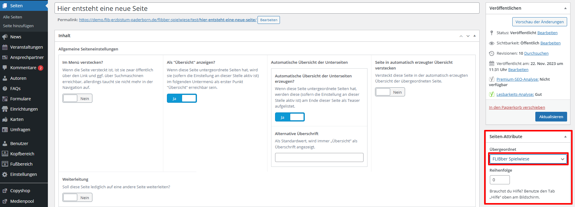Sie können die erstellte Seite schon während der Bearbeitung innerhalb der Navigation zuordnen:Anpassung durch Zuordnung zu einer übergeordneten Seite Durch Auswahl einer anderen Seite im DropDown-Fenster kann die ausgewählte Seite einer anderen untergeordnet werden. Sie erscheint dann innerhalb der Frontend-Navigation in dem entsprechenden Untermenü.