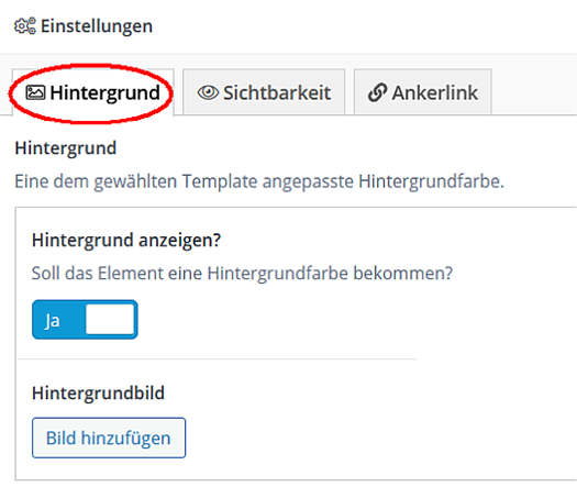 Klicken Sie im Seitenelement oben auf den Balken „Einstellungen“ und wählen Sie den ersten Reiter „Hintergrund“: