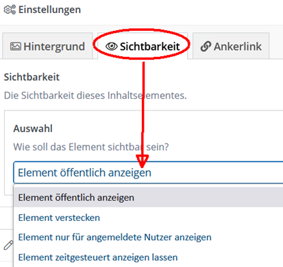Standardmäßig wird ein Seitenelement im Frontend öffentlich angezeigt. Sie haben aber auch andere Möglichkeiten: