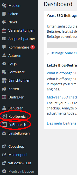 Im Fußbereich können Sie Kontaktdaten hinterlegen, die Social Media Icons anlegen (bitte hier kein https:// vor der URL hinzufügen), das Kontaktfähnchen (Premium-Modul) mit wichtigen Daten oder Kontaktmöglichkeiten bestücken sowie eventuelle Partnerlogos hinzufügen.